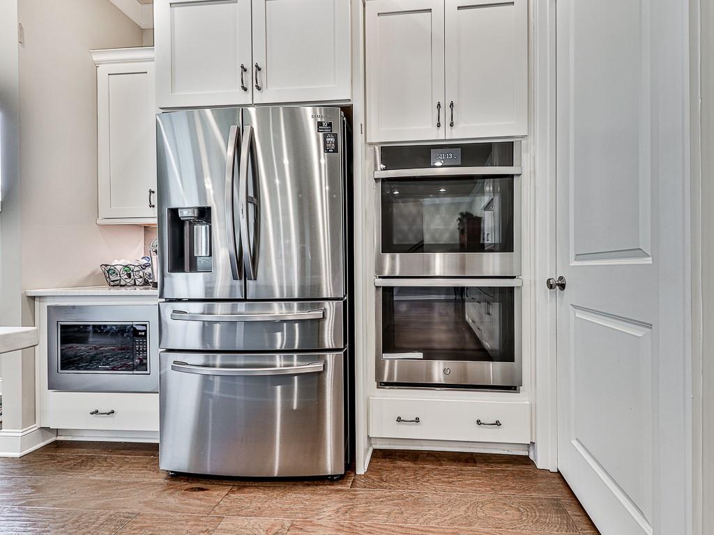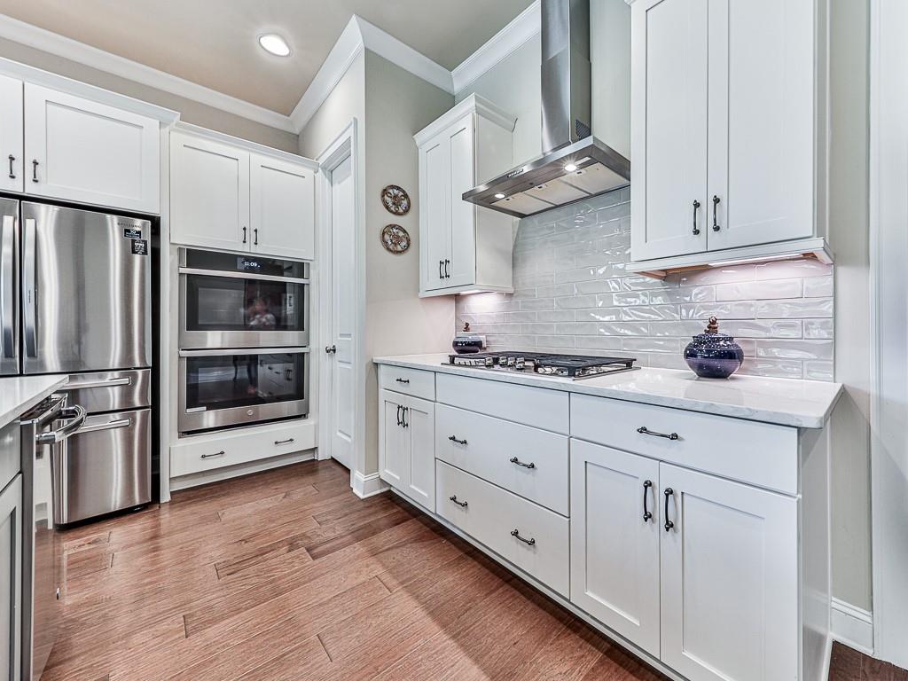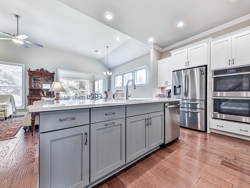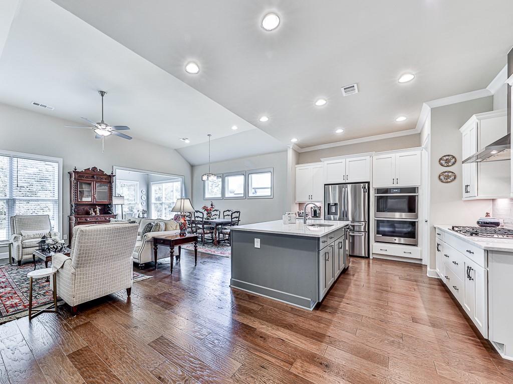 Kitchen: Upgraded with high-end finishes, including gas cooktop, double oven, microwave, island/breakfast bar, and beautiful hardwood floors.