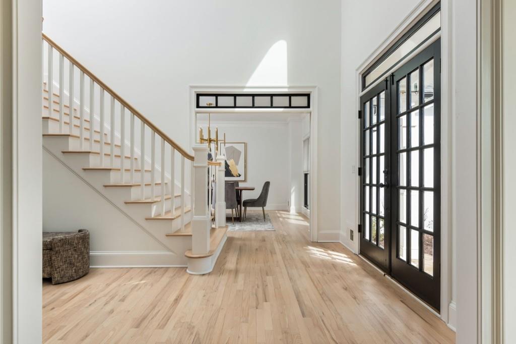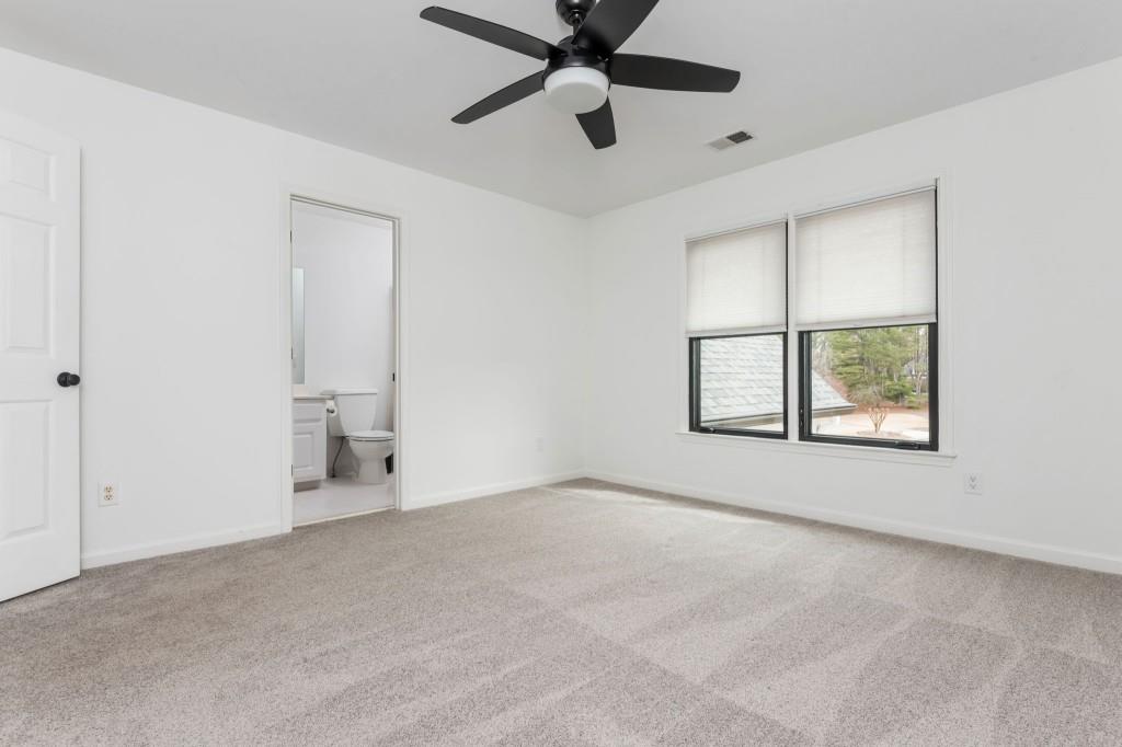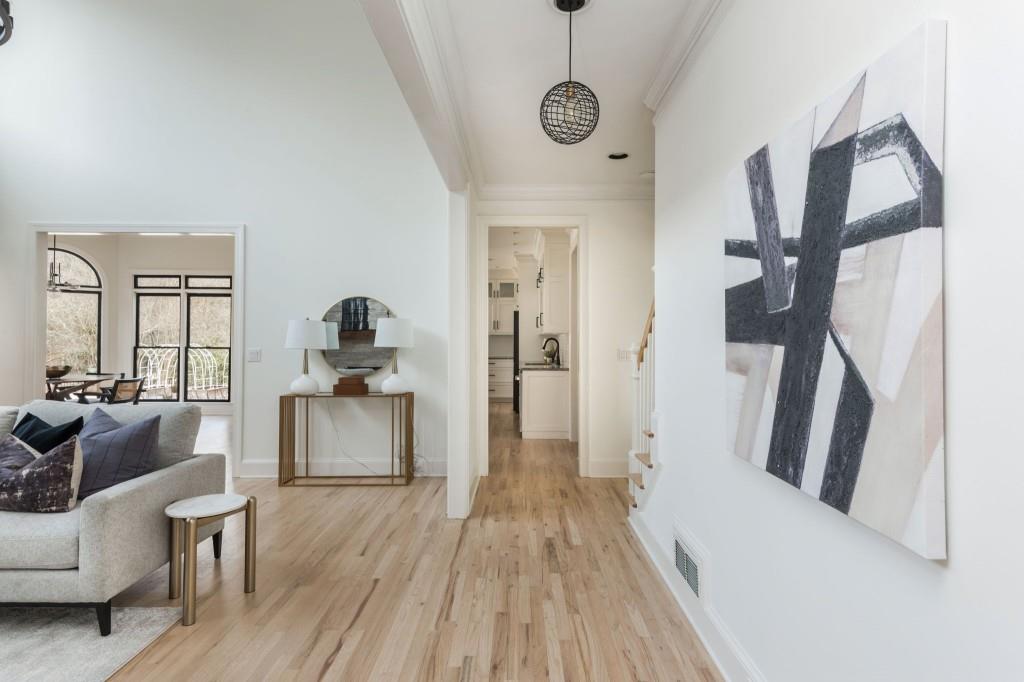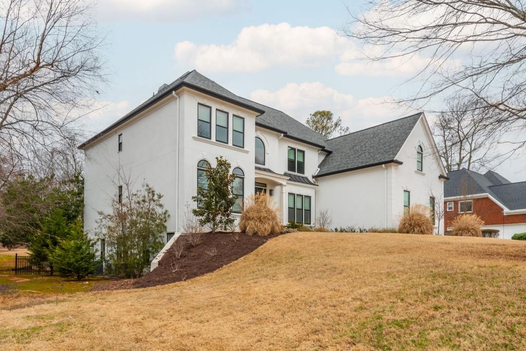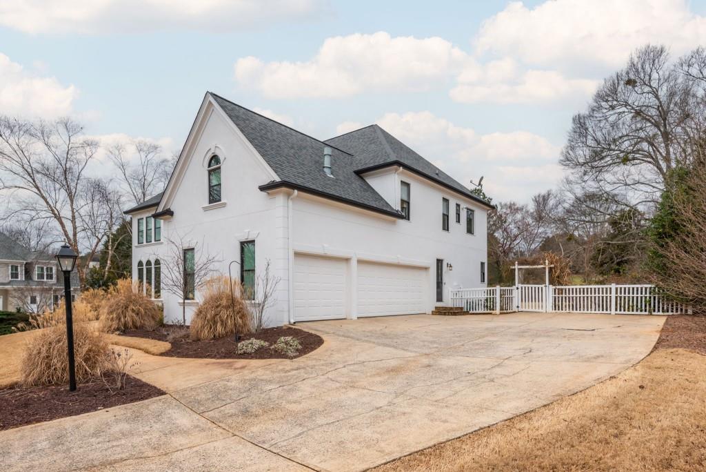 Discover this captivating residence in White Columns Country Club, where modern enhancements and meticulous care create a standout home in a picturesque natural town setting. Set on a highly desirable level lot, the incredibly private backyard boasts flat, lush grass and a new Trex deck with an awning-perfect for outdoor entertaining. Inside, gleaming hardwood floors guide you to a breathtaking chef's kitchen featuring quartzite counters and abundant storage that overlooks a stunning great room. The main level also offers a spacious guest suite, while upstairs, you'll find three bedrooms plus a luxurious master retreat that showcases an elegant tray ceiling and an additional flex space ideal for a home office or relaxation area. The primary bath is equally impressive, with double vanities, a soaking tub, and a large walk-in shower. Finished lower level-including one bedroom plus a versatile room that can serve as a seventh bedroom-a wet bar, media room, and so much more, this home has it all! Located on a quiet street just a short walk to the pool, tennis courts and golf club and zoned for award-winning schools, this exceptional property truly stands out!